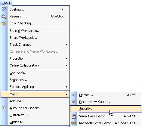 Enabling Macros in Office 2003 From the Tools menu, select Macro, then Security. The example below is from Excel. The menus in the other Office applications will appear slightly different.