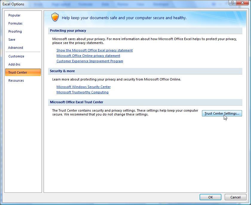 The application will open the Options Dialog Box. Select Trust Center on the left, then select Trust Center Settings over on the right. |
