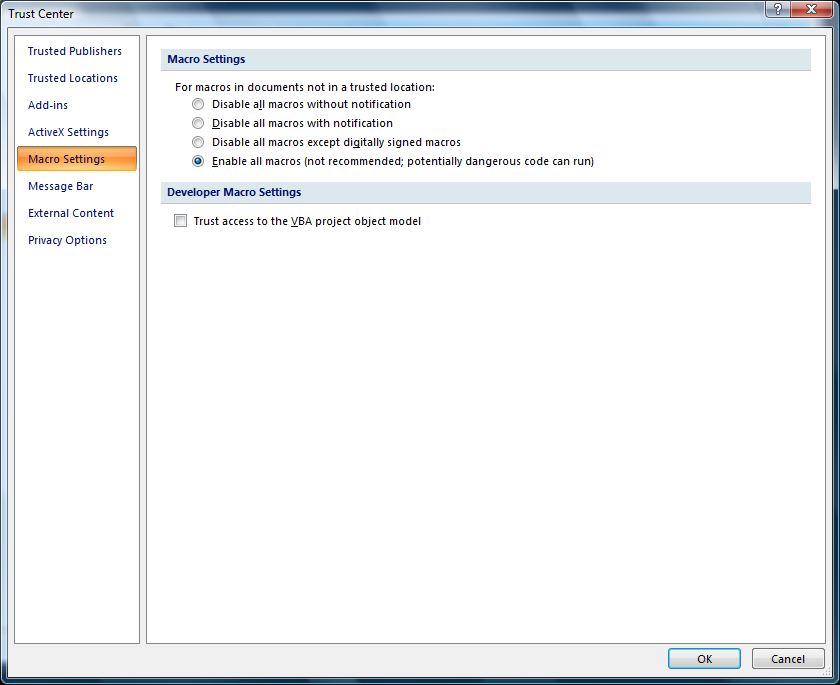 The application will open the Trust Center Dialog Box. Select Macro Settings on the left. From the Macro Settings options, select Enable all macros. Select OK. The application will return to the Options Dialog Box. Select OK again. |