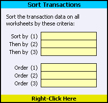 In addition to sorting the transactions on a single data field from the Select Trans and Trans Selected worksheets, the Sort Transactions tool lets you sort on up to three data fields, with a separate sort order for each field. To apply the sort criteria, right-click on the yellow cell at the bottom of the Sort Transactions section of the Tools worksheet. The input cells have drop down lists you can use to select the settings. To open a list, click on the input cell, then click on the down arrow button that appears next to the cell. You can toggle through a list by right-clicking on the input cell. If you don't select a sort order, the default order is ascending.