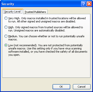 The application will open the Security Dialog Box. Select the Low option, then select OK.