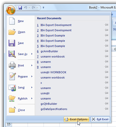 Enabling Macros in Office 2007 Click on the Office button, then select the Options button. The example below is from Excel. The available selections in the other Office applications will appear slightly different.