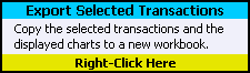 By default, the Y axes of the histogram charts are scaled automatically. Each chart will have the scale best suited to its own data. To make comparing the histograms to each other, you may want them to use a common Y axis scale. The workbook will apply a common Y axis scale when the Common Histogram Y Axis checkbox is filled. You can toggle the checkbox setting by right-clicking on it. To change the setting using the keyboard, enter "X" to fill the checkbox or press [Delete] to empty it. Exporting the Selected Transactions You can copy the selected transactions, the relevant statistics, and the currently displayed charts to a new workbook. If you are working with a large set of transactions, this allows you to create subsets of the data that you can work with independently. To export the selected transactions, right-click on the yellow cell at the bottom of the Export Transactions section of the Tools worksheet.