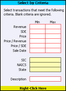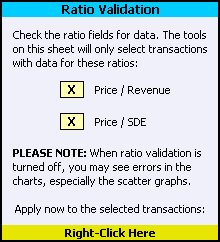 Some transaction records do not have enough data to calculate Price to Revenue and/or Price to SDE. You can omit these transactions from your analysis by filling the checkboxes for the ratios that you want to validate in the Ratio Validation section of the Tools worksheet. You can toggle a checkbox setting by right-clicking on it. To change the setting using the keyboard, enter "X" to fill the checkbox or press [Delete] to empty it. To apply the ratio validation settings to transactions that you have already selected, right-click on the yellow cell at the bottom of the Apply Ratio Validation section labeled Right-Click Here. |